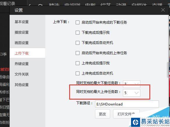 6、在上傳下載選項右側窗格中,找到“同時支持的最大上傳任務數”選項并將此選項修改成我們需要的數量即可。如圖所示;
