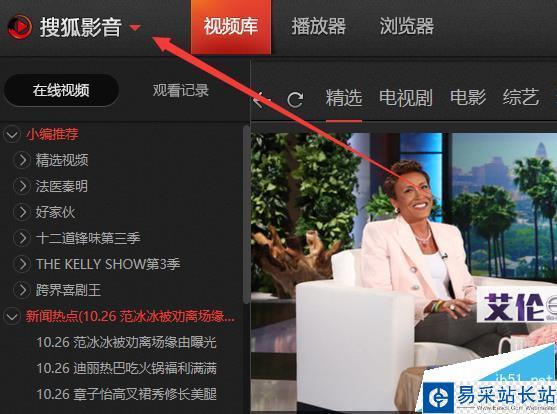 2、在打開的搜狐視頻程序窗口,點擊左上角的搜狐視頻下拉按鈕。如圖所示;