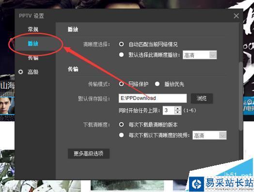 5、在PPTV設置對話框中,選擇左側窗格的“播放”選項卡。如圖所示;
