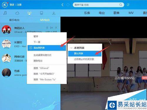 4、看到自己喜歡的mv音樂,右鍵點擊mv電臺名稱,選擇“添加到列表”》“默認列表”