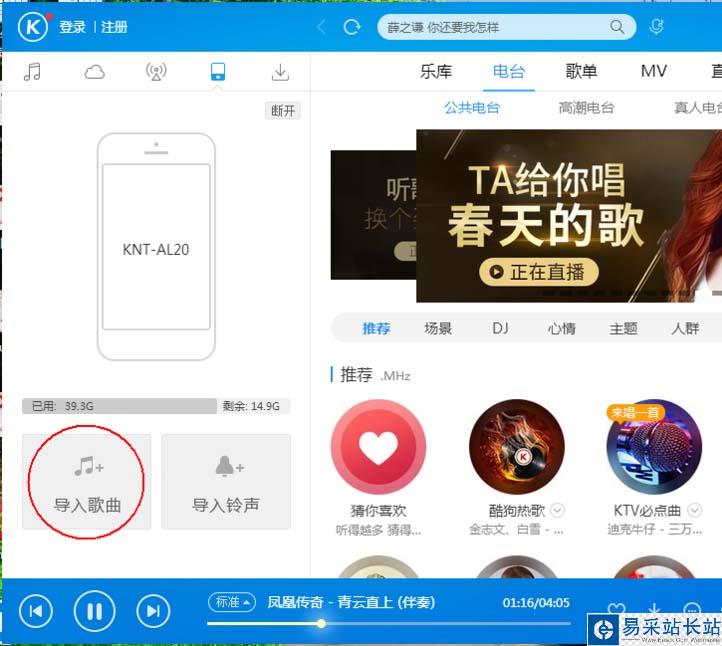 8、現(xiàn)在再次回到電腦窗口,還是在那個手機菜單下面,現(xiàn)在可以看到之前的二維碼變成了手機圖標,在手機圖標下面有個導(dǎo)入歌曲,點擊”導(dǎo)入歌曲“就可以了
