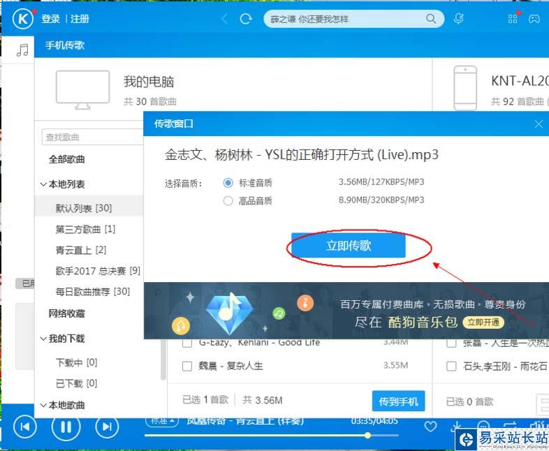 12、音質(zhì)選擇完成以后單擊”立即傳歌“,現(xiàn)在就可以進行歌曲傳送了,等待歌曲下載