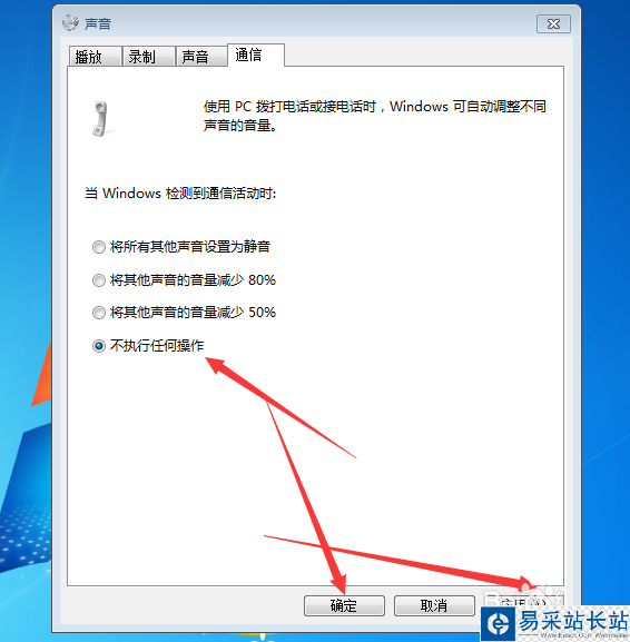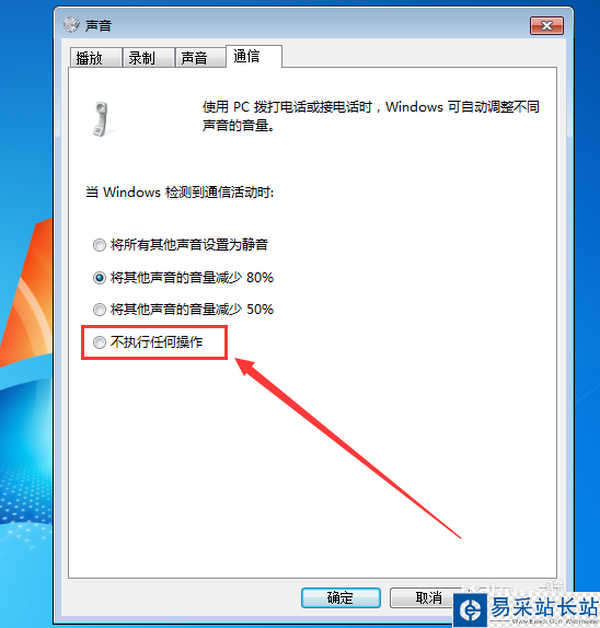 4、打開通信選項之后,我們在它底下的選項里選擇“不執(zhí)行任何操作” 如圖