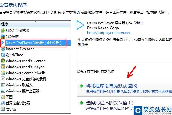 然后選擇potplayer,點擊“將此程序設置為默認值”