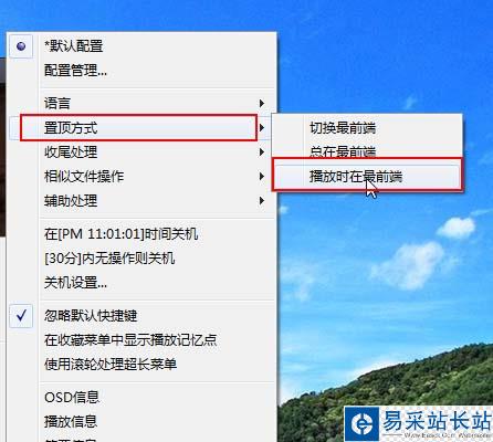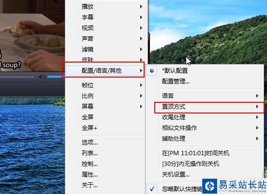 打開播放器以后在播放器的任意位置右擊鼠標,點擊“配置/語言/其他”,選擇“置頂方式”