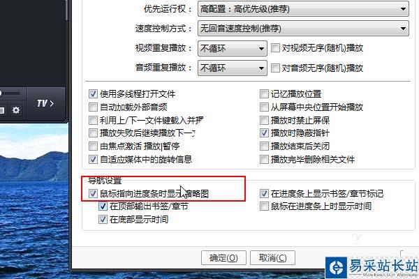 在彈出的設置窗口底端“導航設置”的第一項勾選“鼠標指向進度條的時候顯示縮略圖”