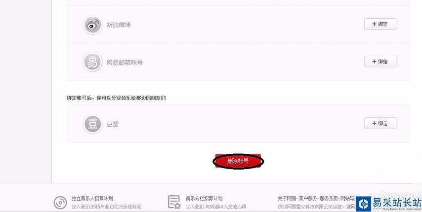 4、在“綁定設(shè)置”頁(yè)面中,下拉至頁(yè)面底部,會(huì)出現(xiàn)“刪除賬號(hào)”選項(xiàng),如果非多余賬戶,請(qǐng)謹(jǐn)慎操作