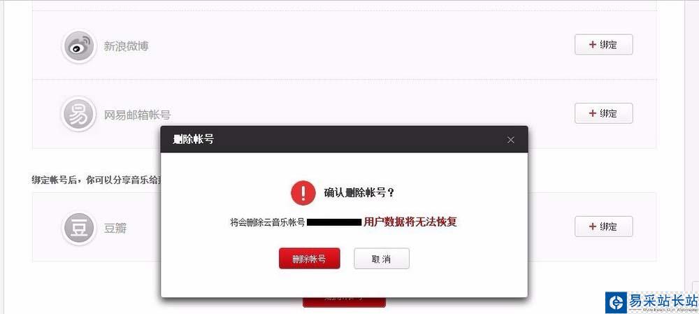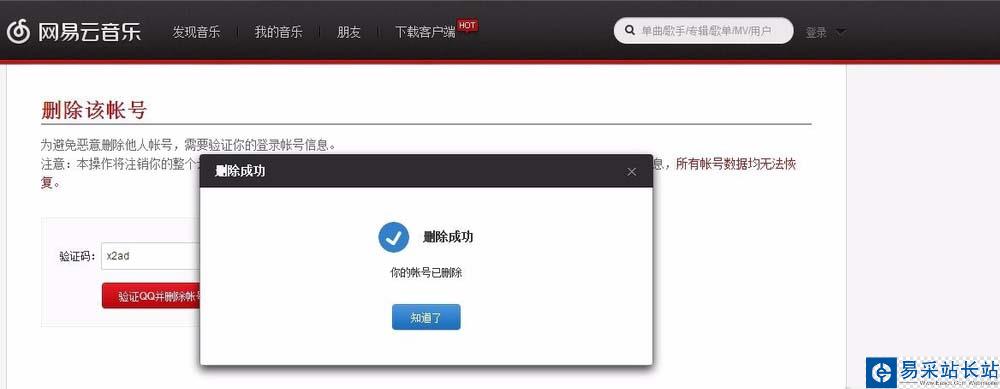 8、QQ登陸成功則表示驗(yàn)證成功,所以刪除網(wǎng)易云音樂(lè)賬號(hào)成功,出現(xiàn)以下“刪除成功”“您的賬號(hào)已刪除”的提示