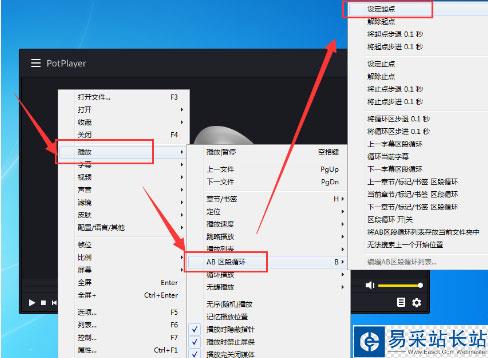 2、添加好視頻后我們拖動進度條到循環(huán)播放區(qū)段的起點,接著再用鼠標(biāo)右鍵點擊視頻畫面,這次在彈出的選項中打開“播放”—“AB區(qū)段循環(huán)”—“設(shè)置起點”,如下圖所示: