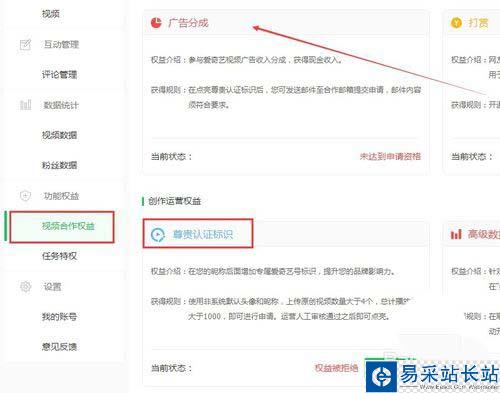 2、點(diǎn)開視頻合作權(quán)益,先申請(qǐng)尊貴認(rèn)證標(biāo)識(shí)(條件:使用非系統(tǒng)默認(rèn)頭像和昵稱,上傳原創(chuàng)視頻數(shù)量大于4個(gè),總計(jì)播放量大于1000,即可進(jìn)行申請(qǐng)。)要原創(chuàng)、畫面中若帶有其他網(wǎng)站水印、電視臺(tái)臺(tái)標(biāo)等情形都無(wú)法通過(guò)認(rèn)證,而且每個(gè)月只能申請(qǐng)一次,被拒絕的話只能過(guò)一個(gè)月才能再一次申請(qǐng)