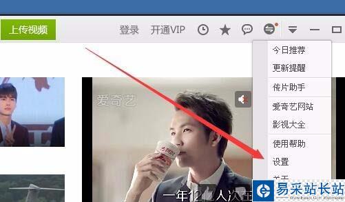 1、在打開的愛奇藝客戶端,點擊右上角的選項按鈕,在彈出菜單中點擊“設置”菜單項