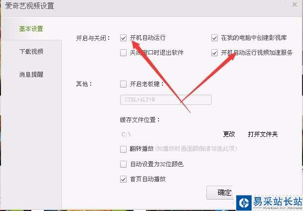 2、在打開的愛奇藝視頻設置窗口中,取消掉“開機自動運行”與“開機自動運行視頻加速服務”前的兩個復選框