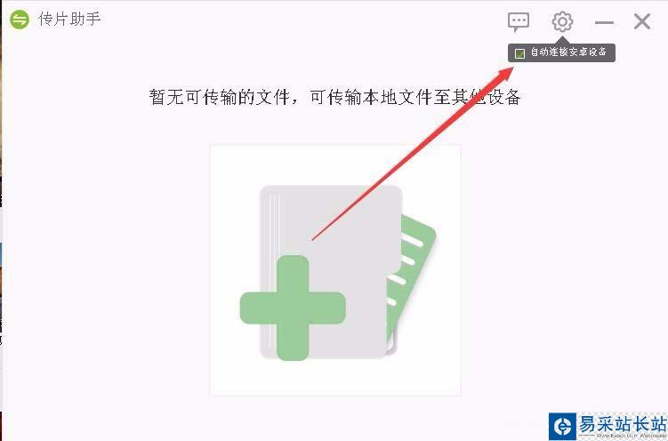 8、這時會打開傳片助手窗口,點擊右上角的設置按鈕,在彈出菜單中去掉“自動連接安卓設備”前的勾選