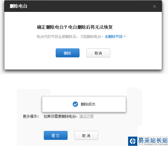 5、點(diǎn)了之后會(huì)彈出刪除電臺(tái)的提示框,點(diǎn)“刪除”即可刪除當(dāng)前電臺(tái)。