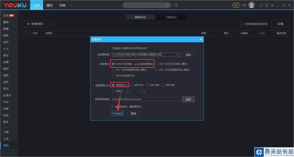 5、將轉碼的格式定位在“MP4”視頻大小,建議啟用“原視頻大小”或者自定義一個大小的視頻,其他感覺都小了不建議選擇不過也要看個人的喜好啦,設置好后點擊“開始轉碼”;