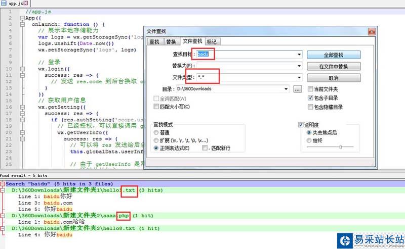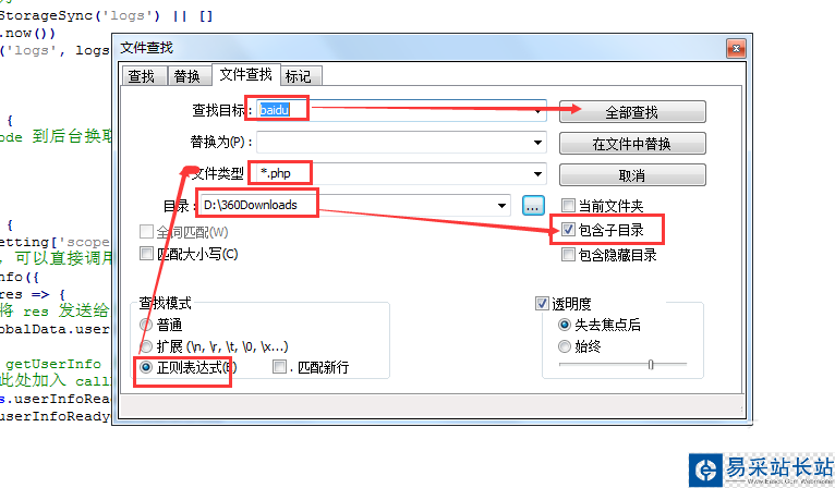 6、像這里就是在D盤的360Downloads文件夾及其子文件夾下查找包含baidu字符串的所有文件并標注出來位置。*.*代表的就是所有文件類型,而*.php代表的是PHP文件類型。