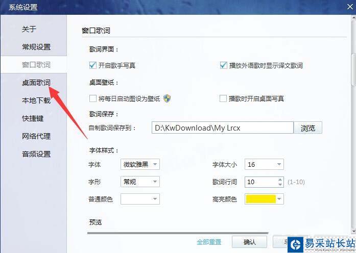 5、在頁面是左側(cè)菜單中,我們找到并點擊桌面歌詞,如圖所示。