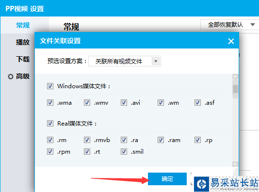 4、就會彈出了一個pp視頻設置窗口界面當中,選中常規選項,設置點擊文件關聯設置,點擊設置文件關聯按鈕。