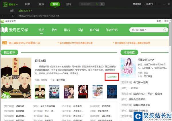 4、這時,就會在愛奇藝的內部打開愛奇藝文學的頁面。打開愛奇藝文學的頁面以后,如果對其中的某本小說感興趣,就可以點擊該小說下面的“立即閱讀”。