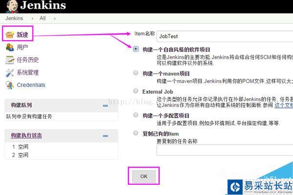 1、點擊左側“新建”——“Item名稱”(JobTest)——“構建一個自由風格的軟件項目”——“OK”