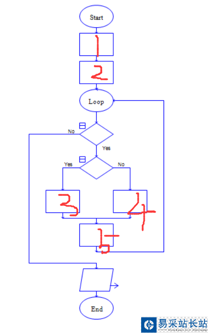 2、在Start 和 end之間依次添加 賦值 賦值 循環 選擇 賦值 賦值 賦值 賦值 輸出 符號添加完后如下圖所示