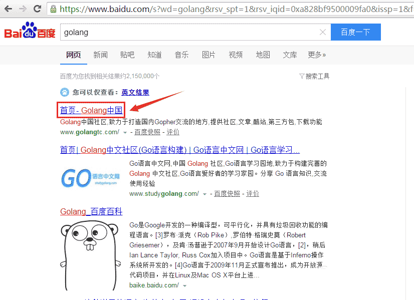 打開百度搜索輸入“golang",在搜索結果中找到“首頁- Golang中國”并點擊打開對應網頁;