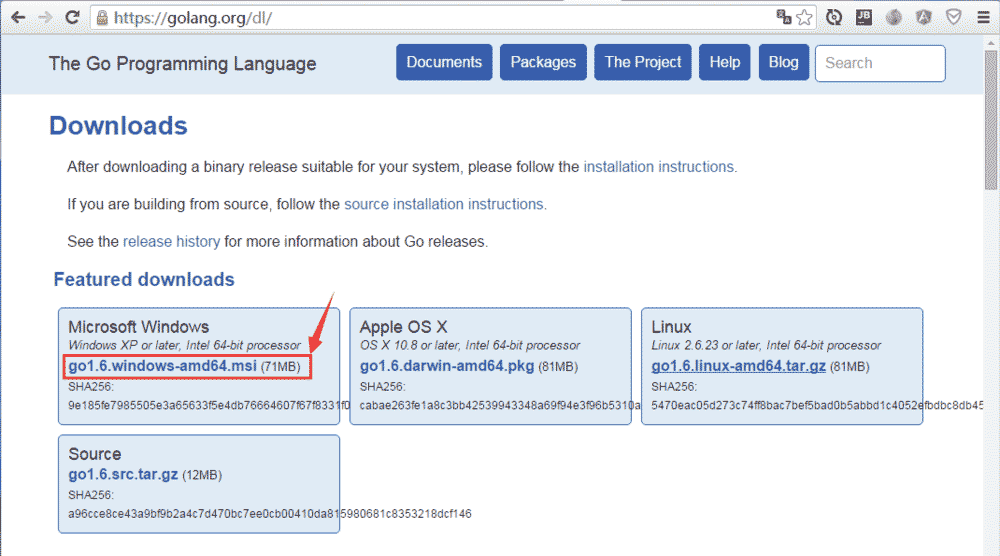 當前對應我操作系統的最新版本為go1.6.windows-amd64.msi。