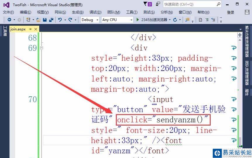6、設(shè)置按下按鈕后,執(zhí)行的操作為sendyanzm()函數(shù),通過(guò)此函數(shù)向手機(jī)發(fā)送驗(yàn)證碼。