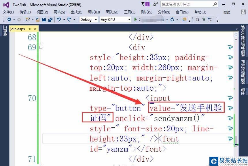5、設(shè)置按鈕的值為發(fā)送手機(jī)驗(yàn)證碼,即按鈕顯示的名稱為發(fā)送手機(jī)驗(yàn)證碼。