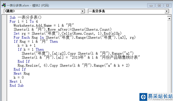 Sub 一表分多表()For i = 1 To 4 Worksheets.Add.Name = i & "月" Sheets(i & "月").Move after:=Sheets(Sheets.Count) Set rg = Sheets("年度").Cells(Rows.Count, 1).End(xlUp) For Each Rng In Sheets("年度").Range(Sheets("年度").[a3], rg) If Rng = i & "月" Then k = k + 1 If k = 1 Then Sheets("年度").[a1:g2].Copy Sheets(i & "月").Range("a1") Sheets(i & "月").[a1] = "2019年" & i & "月份產(chǎn)品銷售統(tǒng)計(jì)表" End If Rng.Resize(, 6).Copy Sheets(i & "月").Range("a" & k + 2) End If Next Rng k = 0Next iEnd Sub
