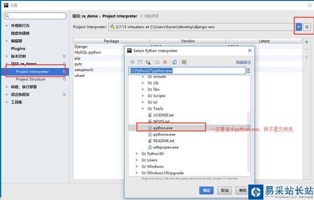 在文件->設置->項目:xxx下找到Project Interpreter。然后修改為你需要的Python解釋器。注意這個地方一定要注意的是:在選擇Python解釋器的時候,一定要選擇到python.exe這個文件,而不是python的安裝文件夾。