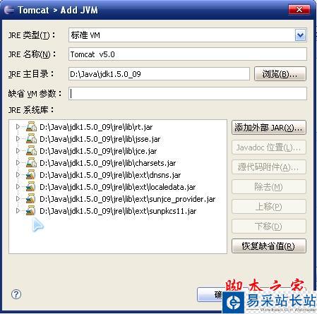 JRE名稱(N)選項填上名字(可以隨便取),在JRE主目錄選項選擇你的jdk安裝目錄(僅僅只是jdk,不包含jre),JRE系統庫系統會自動添加,缺省JVM參數可以不用填,按“確定”回到上級再按“確定”就OK了。
