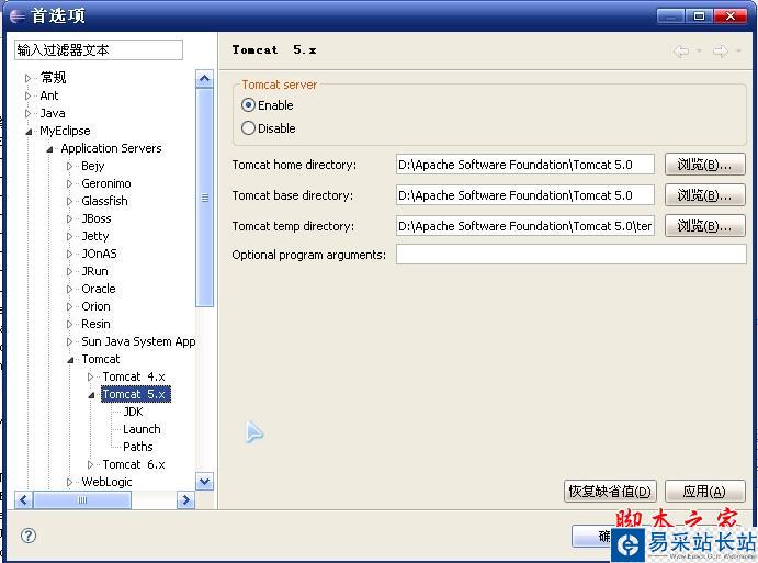 二、根據自己的Tomcat版本選擇相應的Tomcat選項(我的是5.0版本),然后在對話框右側的Tomcat home directory選項選擇Tomcat的安裝目錄,下面的Tomcat base directory和Tomcat temp directory系統會自動為你填上,Optional  program arguments可以不用填,我也不知道這是做什么用的,再選上Enable選項,要不然在待會兒在Server中看不到Tomcat服務器