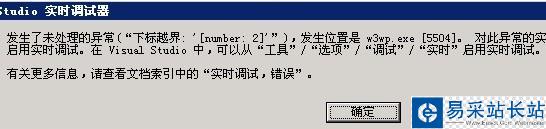 彈出應用程序: Visual Studio 實時調試器: 發生了未處理的異常(“下標越界: '[number: 0]'”),發生位置是 w3wp.exe [2472]。 對此異常的實時調試失敗,錯誤為: 安裝的調試器都沒有啟用實時調試。在 Visual Studio 中,可以從“工具”/“選項”/“調試”/“實時”啟用實時調試。