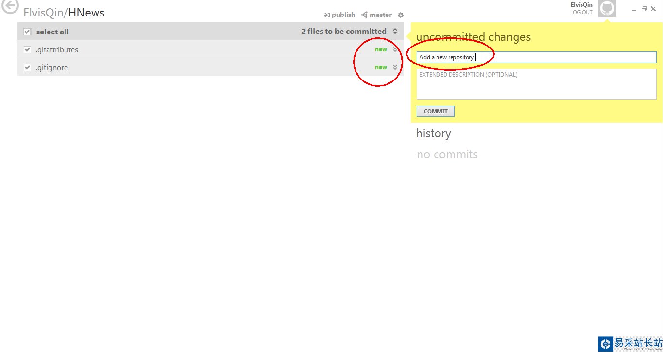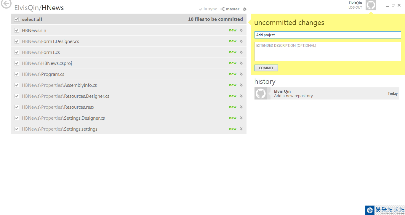 5. 將修改提交到本地倉庫,回到Github for windows中,已經可以看到剛才添加的項目了,同樣,提交注釋提交到本地倉庫: