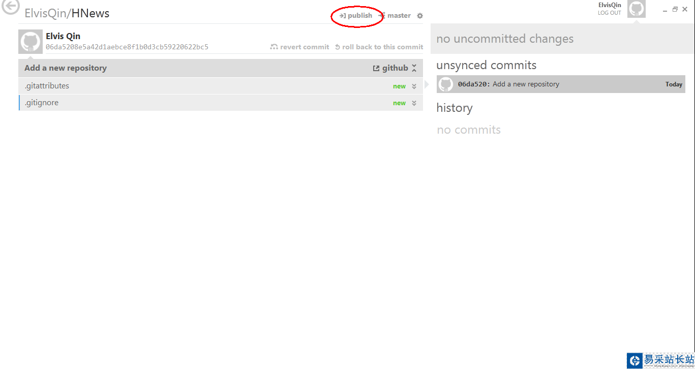 5. 這個時候我們就可以Publish一個倉庫了,Publish之后按鈕就變成in sync文字,表示以后的修改提交就是同步,這個時候你到你的github上看應該就會多一個倉庫了: