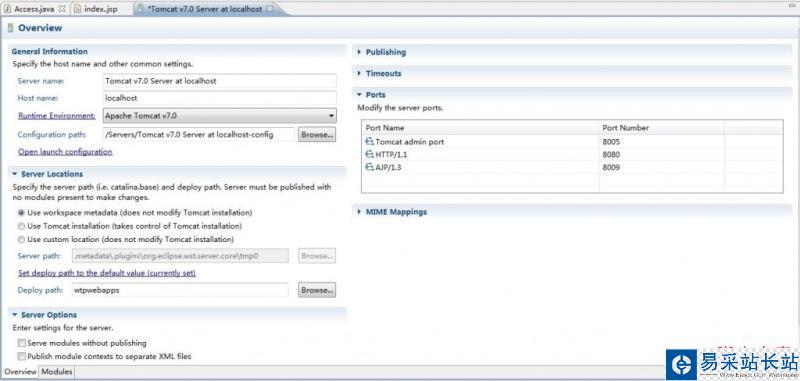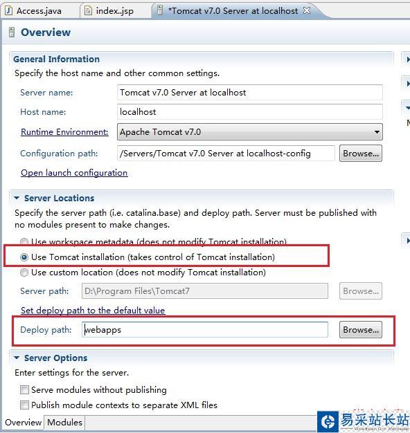 3、在“Server Locations”處選擇“Use Tomcat installation”,可以清楚的看到默認(rèn)是“Use Workspace metadata”,即上邊所說(shuō)的目錄。然后在Deploy的path處寫(xiě)上webapps即可,如下圖所示: