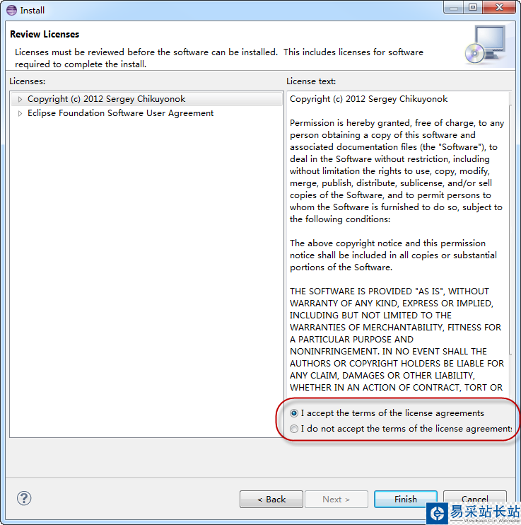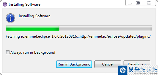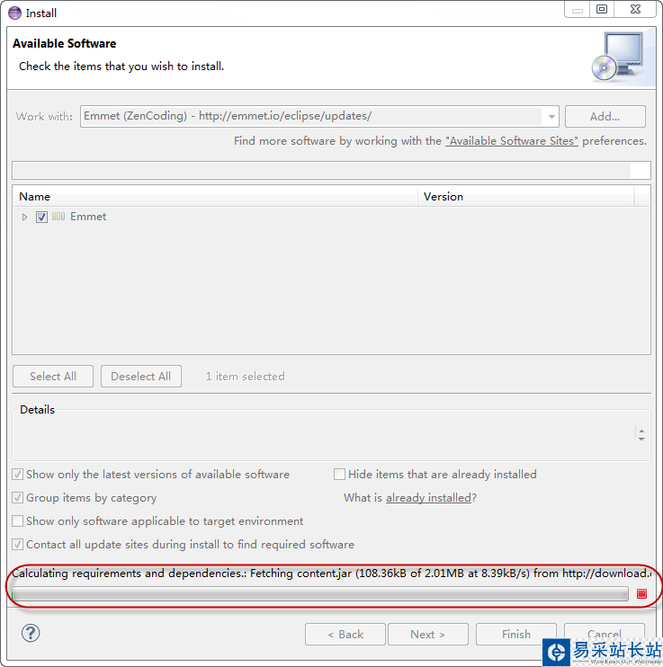 當(dāng) Install 對話框中顯示出了 Emmet 選擇項(xiàng)后,選擇 Emmet,一路 Next,到最后一步,選擇 I accept the terms of th license agreements,單擊 Finish,彈出下載對話框,開始下載必要的組件: