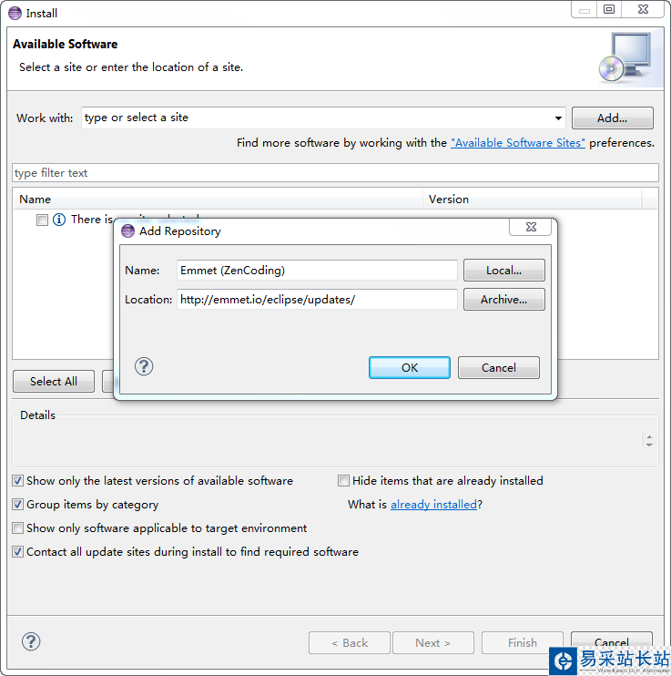 在彈出的對話框的 Location 一欄輸入 http://emmet.io/eclipse/updates/ ,在 Name 一欄隨便輸入一個名字,比如 Emmet,單擊 OK: