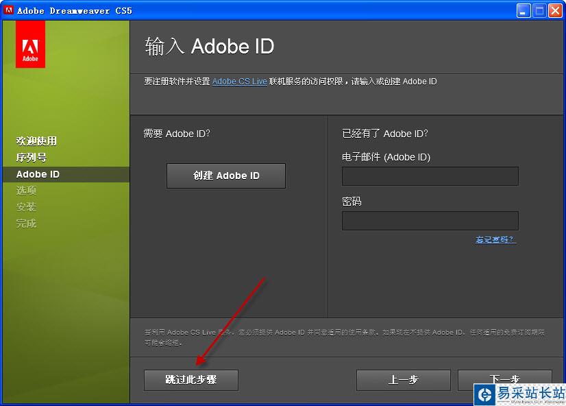 6、點擊下一步后,出現一個對話框讓你輸入adobe ID,這里可以不用輸入,直接跳過。