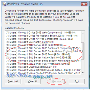 步驟2 :安裝Windows Installer Clean Up.(msicuu2.exe文件)。安裝完后運行界面如下: 選定下面條目,然后按《Remove》: Microsoft SQL Server VSS Writer Microsoft SQL Server Setup Support Files(English) Microsoft SQL Server Native Client Microsoft SQL Server 2005 Tools Microsoft SQL Server 2005 Books Online(English) Microsoft SQL Server 2005 Backward compatibillty Microsoft SQL Server 2005