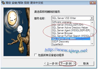 步驟3 :運行SRVINSTW.exe文件,如下圖: 選擇:移除系統服務,然后《下一步》 選擇:本地服務器,然后《下一步》 分別選擇服務名稱: SQL Server VSS Writer SQL Server FullText Search(MSSQL) SQL Server Browser SQL Server Agent(MSSQLSERVER) SQL Server Active Directory Helper SQL Server (MSSQLSERVER) 然后《下一步》, 然后按《完成》