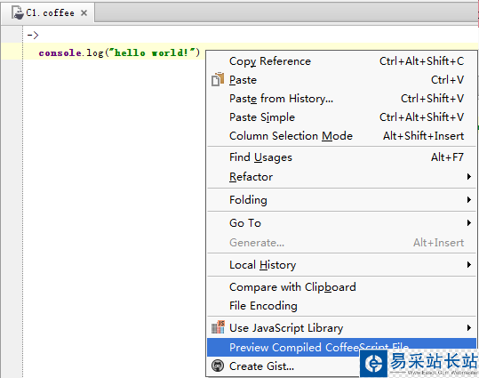 有了一個CoffeeScript源碼文件,寫點啥吧,那就來個“hello world!”,寫完后,右鍵代碼編輯區,在右鍵菜單里選擇“Preview Complied CoffeeScript File...”后,是不是看到了CoffeeScript代碼相對應的JavaScripte代碼了,有點意思。