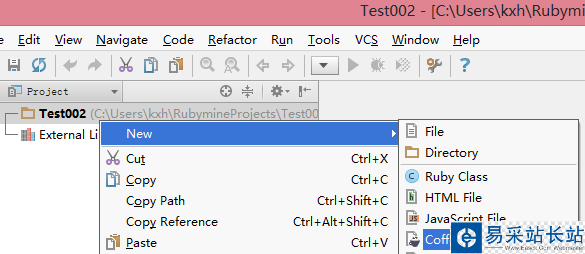 右鍵單擊工程,在右鍵菜單里選擇“New->CoffeeScript File”創建。