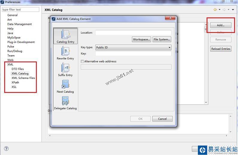 2、再打開的“Preferences”對話框中,選擇左邊的“XML”選項下的“XML Catalog”選項,然后選擇右邊的“Add”按鈕,打開如下的對話框,如圖所示: