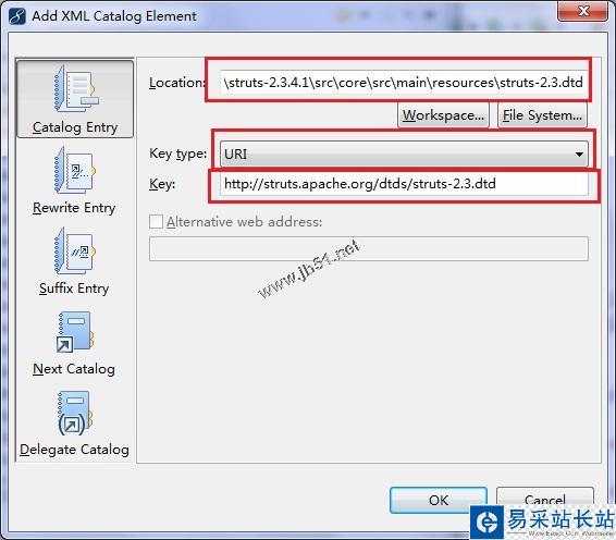 3、在打開的對話框中,在“location”中輸入struts.xml文件所對應的dtd文件的所在位置,最好不要選擇有中文的目錄,有時候正是因為選擇了中文目錄,所以沒有出現提示,選擇“File System”按鈕,找到dtd文件的位置,有人說解壓一個jar包,里邊有需要的dtd文件,其實只要我們下載了struts2的安裝包,在里面的某個文件夾里就有所需的dtd文件根本不用我們解壓,這里我的Struts2的目錄是我的電腦e盤根目錄下,在其中找到如下的路徑“E:/struts-2.3.4.1/src/core/src/main/resources”,在這個路徑下邊有一個“struts-2.3.dtd”的文件,這就是我們要找的文件,所以選中該文件之后,location的內容為:“E:/struts-2.3.4.1/src/core/src/main/resources/struts-2.3.dtd”,接下來在“Key type”的地方選擇類型為“URI”,在“Key”的地方輸入“E:/struts-2.3.4.1/src/core/src/main/resources/struts-2.3.dtd”,這句話可以上該dtd文件DOCTYPE中找到。如圖所示: