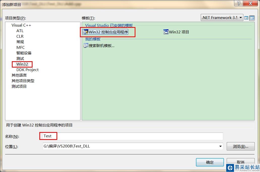 然后選擇 win32-->win32控制臺應用程序-->空項目