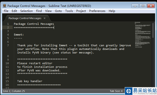 在 Emmet 安裝完成后,會顯示如下屏幕:然后會自動安裝PyV8,安裝完成,重啟 Sublime Text 3。