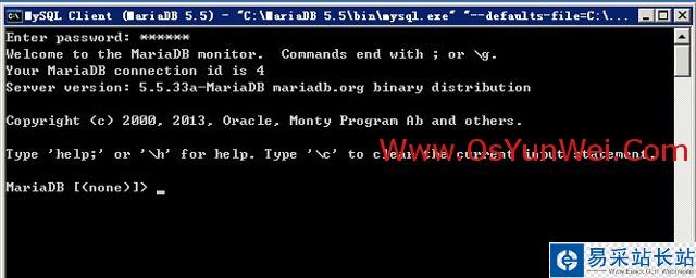 打開MySQL Client (MariaDB 5.5),輸入上面設置的root密碼登錄,如下圖所示