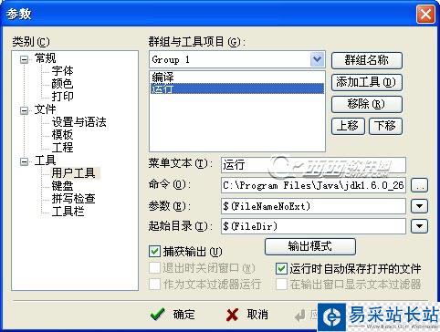 3、首先配置【編譯】功能,按照上圖所示,菜單文本為編譯,命令為javac.exe的路徑,勾選【捕獲輸出】。